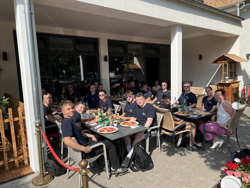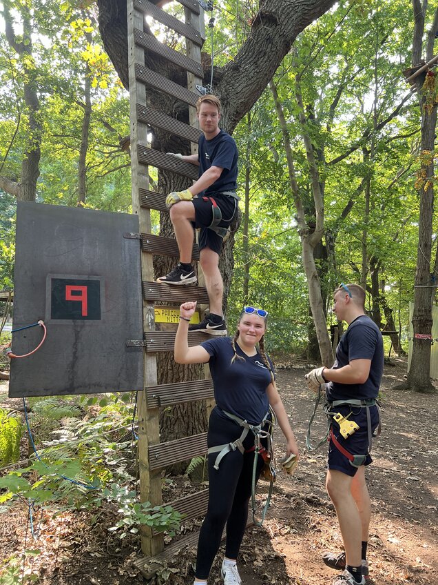 Los ging es mit einer gemütlichen Brötchenrunde bei einem bunten Themenkatalog von unserer Ausbildungsverantwortlichen Mandy Tschirner. Zum Anfang gab es ein Speed-Dating mit dem jeweiligen Azubipaten. Wir haben uns dann alle gegenseitig vorgestellt. Es wurden wieder viele wichtige Themen besprochen und es war eine schöne Atmosphäre. Danach ging es endlich los. In Fahrgemeinschaften sind wir alle nach Hohe Düne gefahren und erst einmal an den Strand gegangen. Wir haben coole Nordwasser-Sonnenbrillen bekommen und damit verschiedene Videos und Fotos für Social Media gemacht. Es wurde Volleyball gespielt und sich angeregt unterhalten. Auf dem Rückweg hatte ich ein sehr schönes Gespräch mit Mandy Tschirner. Mittagessen gab es bei einem Italiener. Bei tollen Gesprächen mit den neuen Azubis, rund ums Thema: meine Erfahrungen in jeglichen Bereichen, haben wir uns unsere Pizza schmecken lassen. Danach sind wir zu dem Kletterwald gegangen. Dort haben wir eine Einweisung bekommen und durften losklettern. Zuerst bin ich mit den anderen Azubis den leichten Parkour geklettert, aber ich wäre ja nicht Pia, wenn ich nicht alles versuchen würde. Es ging also direkt auf den mittelschweren Parkour 8 und 9. Mit ganz viel Überwindung, gutem Zuspruch von meiner liebsten Pauline und einer starken Hand von Justin, habe ich es geschafft. Wir haben gemeinsam als Team alles gemeistert. Die anderen sind uns natürlich fleißig gefolgt und haben es ebenfalls geschafft. Wir haben alles gegeben, bis wir keine Kraft mehr hatten. Im Anschluss gab es noch ein paar Gruppenfotos und ein Abschlussgespräch mit Mandy Tschirner. Dieser Tag war ganz besonders für mich, da ich schöne Stunden mit meinen liebsten Azubi-Kollegen verbringen konnte und wir „die Neuen“ sehr gut kennengelernt haben. Wir sind alle nochmal richtig gut zusammengewachsen - der Teamzusammenhalt war deutlich zu spüren. Außerdem war es echt schön zu hören, dass ich einen jetzigen Azubi angeworben habe und er jetzt Teil von Nordwasser ist. Dieser Tag wird lange in Erinnerung bleiben.