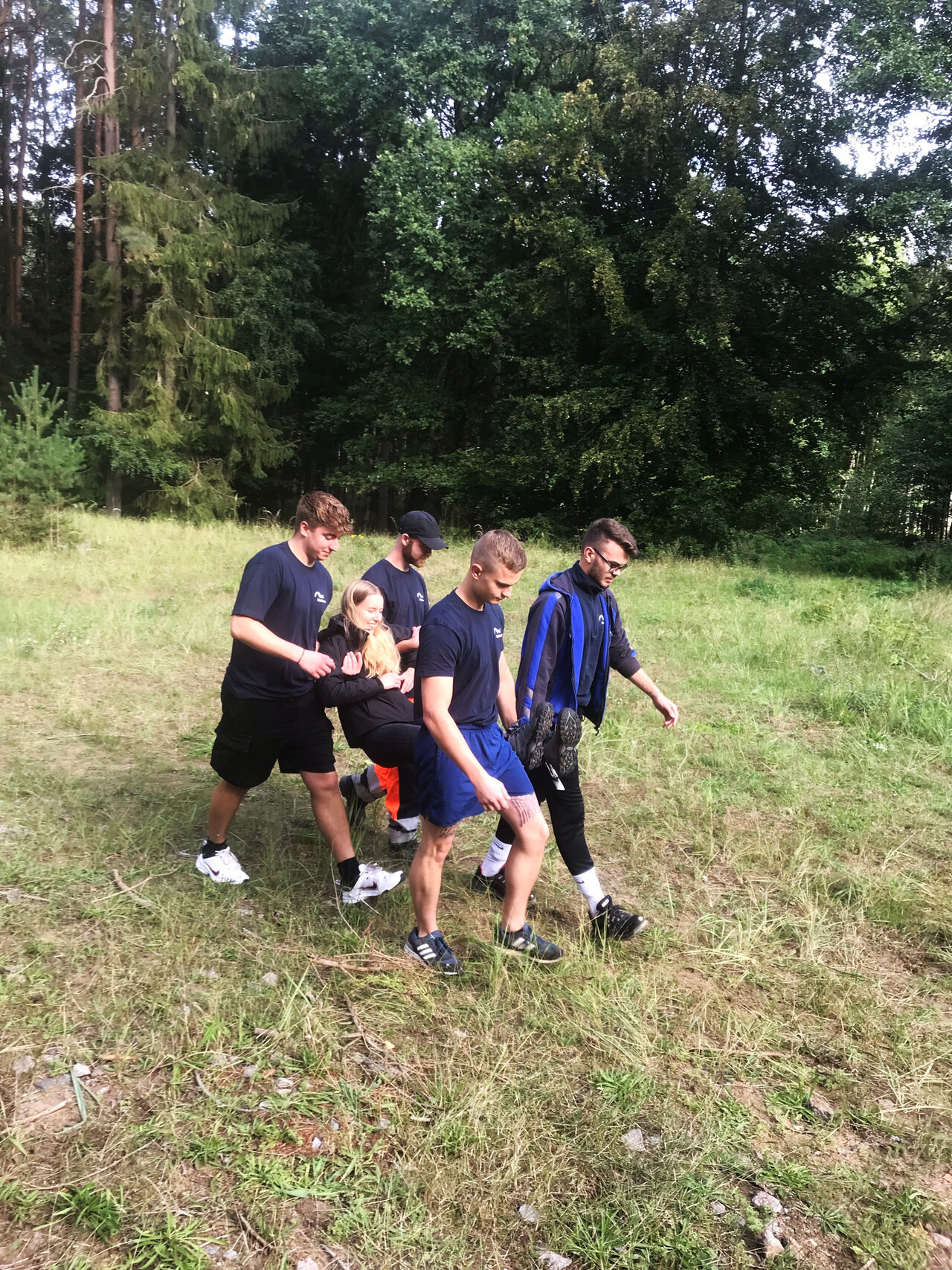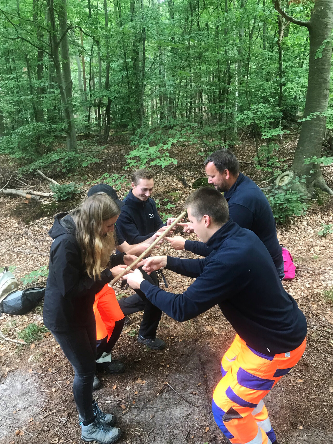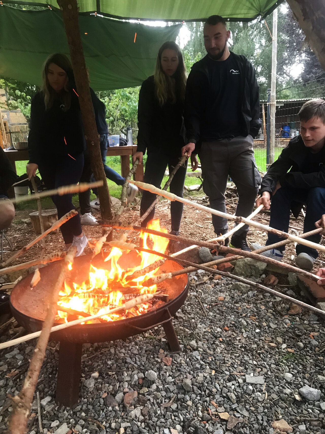 Nach einer kurzen Vorstellungsrunde, ging es auch schon direkt in den Wald. Unser Trainer Fabio konnte die letzten anfänglichen Hemmungen mit dem ein oder anderen Aufwärmspielchen beseitigen. Anschließend teilte er uns in 4 Teams ein und stattete uns mit einer Plane und zwei Seilen aus. Nun hatten wir 40 Minuten Zeit, um uns eine Notunterkunft zu bauen. Es wurde also hektisch nach einem perfekten Platz gesucht und angefangen zu bauen. Die ganz flinken unter uns, haben sogar einen richtigen Lagerplatz mit Feuerstelle und Sitzgelegenheiten gebaut. Schlussendlich konnten sich aber alle Hütten sehen lassen und eine Unterkunft für die Nacht wäre gesichert gewesen. Nach einer kurzen Mittagspause ging es wieder direkt in den Wald und Fabio sorgte mit seiner Stationsarbeit, die die Teamarbeit fördern sollte, für den einen oder anderen Schmunzler. Da es zum Ende der Veranstaltung noch ein leckeres Stockbrot geben sollte, mussten wir uns dafür die benötigten Stöcker im Wald suchen und schnitzen. Natürlich durfte auch Feuerholz nicht fehlen, dieses mussten wir selber noch zurecht hacken und zum Schluss das Lagerfeuer entfachen.