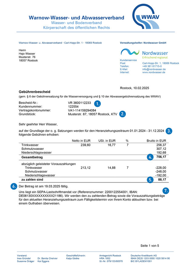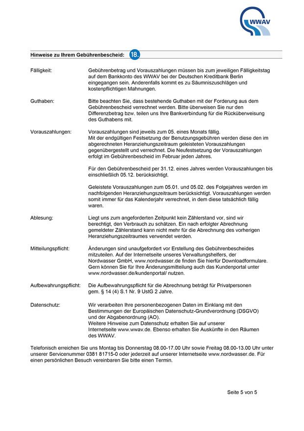 Alle organisatorischen Regelungen sind am Ende des Gebührenbescheids kurz beschrieben. Ebenso erfolgt die Information zum Datenschutz. Weiterführende Fragen zur Abrechnung können Sie gern persönlich unseren Servicemitarbeitern im Haus der Stadtwerke oder telefonisch unter der Nordwasser-Servicenummer stellen.