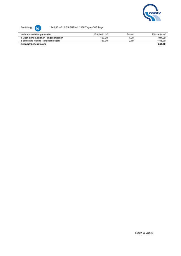 Hier werden die angeschlossenen bebauten und befestigten Flächen in m² und der zu berücksichtigende Faktor auf Grund des Grades der Wasserdurchlässigkeit ausgewiesen. Aus der Multiplikation der Fläche mit dem Faktor ergibt sich die gebührenrelevante Fläche.