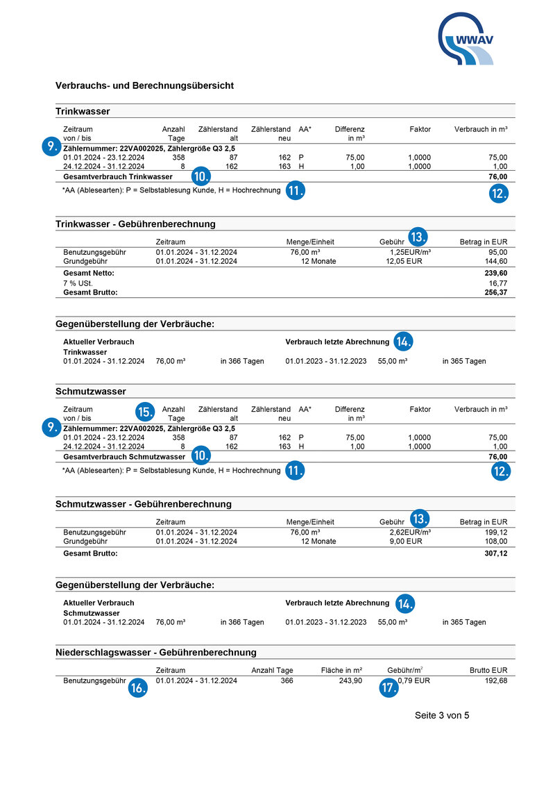 Der ermittelte Verbrauch in m³ wird mit der Mengengebühr multipliziert. In einer eigenen Zeile wird die Grundgebühr je Monat ausgewiesen und berechnet. Die Grundgebühr wird ohne Rücksicht auf den Umfang der tatsächlichen Benutzung erhoben. Die Grundgebühr fällt also auch an, wenn das Grundstück ungenutzt ist.