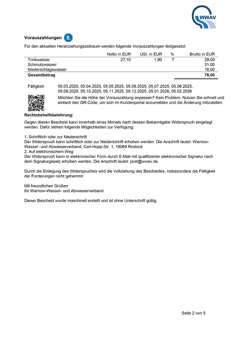 Den Gebührenbescheid des Warnow-Wasser und Abwasserverbandes erhalten Sie in der Regel einmal jährlich im ersten Quartal. Dafür erfragen wir im Vorfeld Ihre aktuellen Zählerstände. Er bezieht sich auf den Heranziehungszeitraum 01. Januar bis 31. Dezember des Vorjahres (Stichtagsabrechnung).