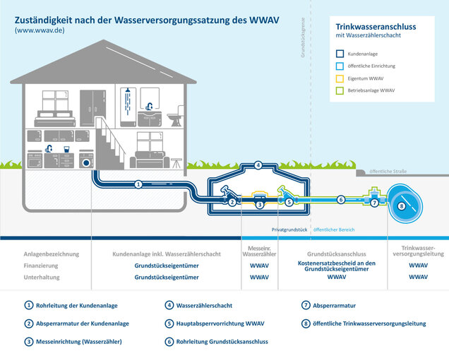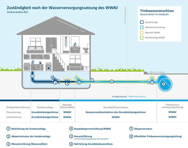 Der Grundstücksanschluss für Trinkwasser besteht aus der Verbindung des Verteilungsnetzes mit der Grundstücksanlage. Er beginnt an der Abzweigstelle der Versorgungsleitung und endet mit der Hauptabsperrvorrichtung. Die Hauptabsperrvorrichtung ist das in Fließrichtung des Trinkwassers vor der Messeinrichtung angeordnete Absperrventil. Der Grundstücksanschluss gehört zur Betriebsanlage des WWAV und steht in dessen Eigentum.