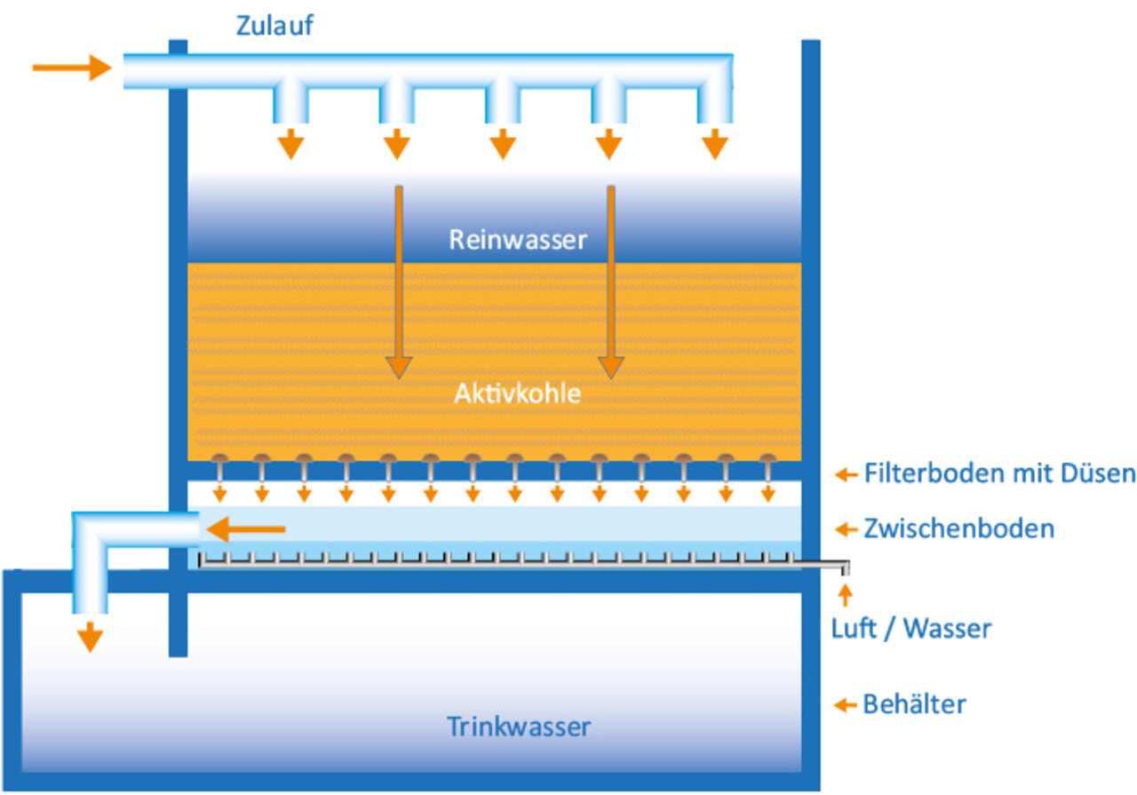 Im Aktivkohlefilter werden weitere organische Inhaltsstoffe entfernt. Ebenso werden Geruchs- und Geschmacksstoffe zurückgehalten.